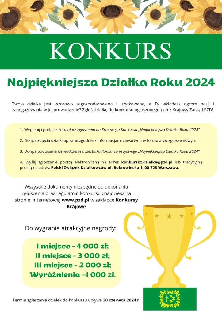 1. Wypełnij i podpisz Formularz zgłoszenia do Krajowego Konkursu „Najpiękniejsza Działka Roku 2024”. 2. Dołącz zdjęcia działki opisane zgodnie z informacjami zawartymi w formularzu zgłoszeniowym 3. Dołącz podpisane Oświadczenie uczestnika Konkursu Krajowego „Najpiękniejsza Działka Roku 2024” 4. Wyślij zgłoszenie pocztą elektroniczną na adres konkurskz.dzialka@pzd.pl lub tradycyjną pocztą na adres: Polski Związek Działkowców ul. Bobrowiecka 1, 00-728 Warszawa.Termin zgłaszania działek do konkursu upływa 30 czerwca 2024 r.
