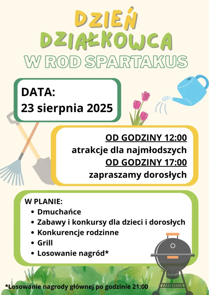 Dzień Działkowca w ROD Spartakus! Serdecznie zapraszamy wszystkich działkowców i ich rodziny na wspólne świętowanie! 🎉📅 23 sierpnia 2025👧 Od godziny 12:00 – atrakcje dla najmłodszych.
